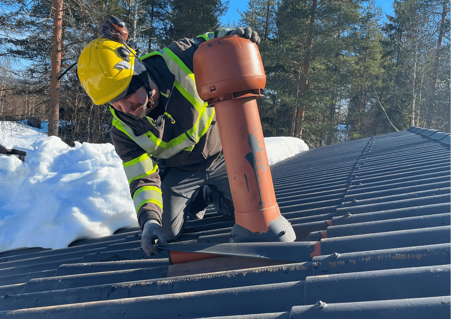Korjaamme mahdolliset vauriot ja vuotokohdat katteessa ja läpivienneissä. Usein havaitaan vuotavia piipun juuria, irtonaisia kattoturvaturva- tai sadevesijärjestelmiä.